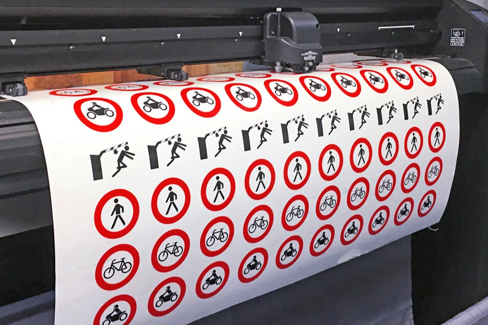 Beschriftung konturgeschnitten – hier frisch entgittert auf unserem Laminiertisch